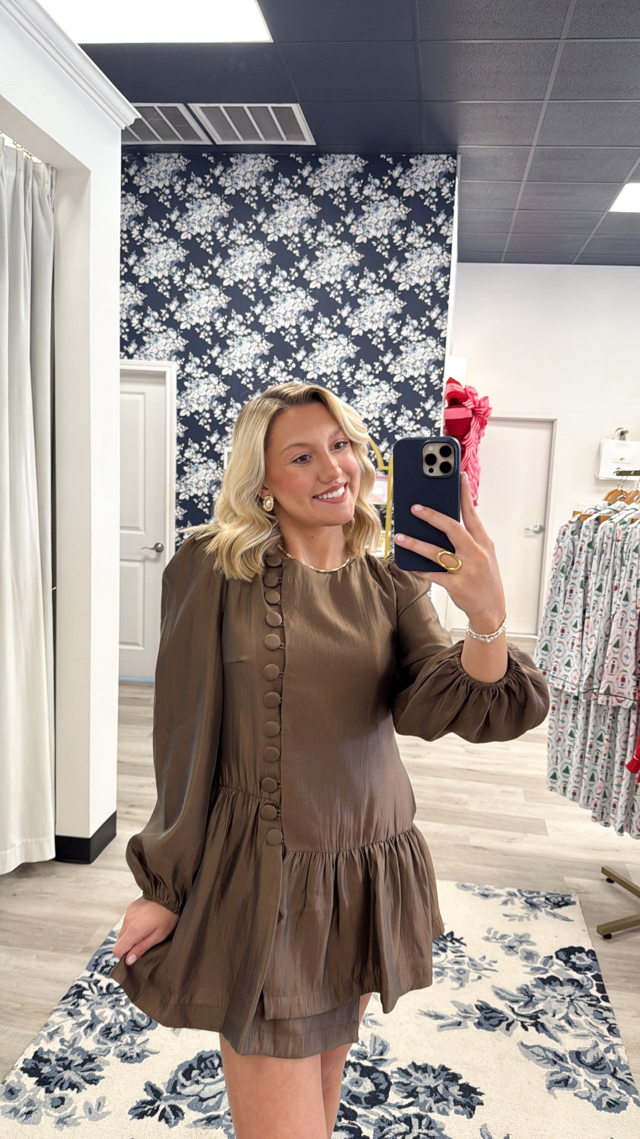 Elevate your wardrobe with this striking asymmetric mini dress in rich espresso. Featuring a self-covered button front and sophisticated silhouette, this piece effortlessly transitions from day to evening. The asymmetrical hemline adds modern edge while maintaining an air of refined elegance. Perfect for those who appreciate bold, contemporary style with timeless appeal.