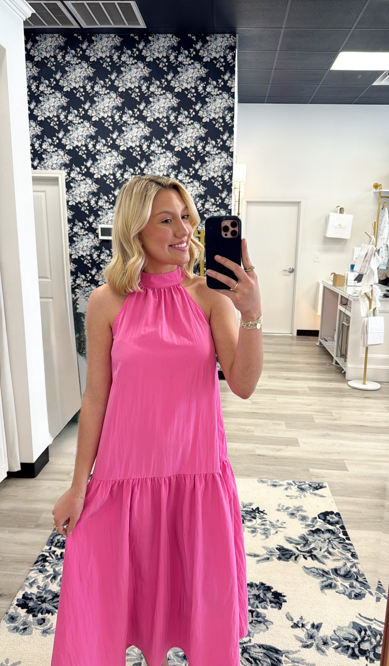 Hot pink halter neck sleeveless midi dress with a refined silhouette that transitions effortlessly from day to evening. The halter neckline provides elegant support while the midi length offers a polished, versatile look. Perfect for occasions where you want to make a statement without sacrificing sophistication. Pair with minimal accessories to let the vibrant color and clean lines take center stage.