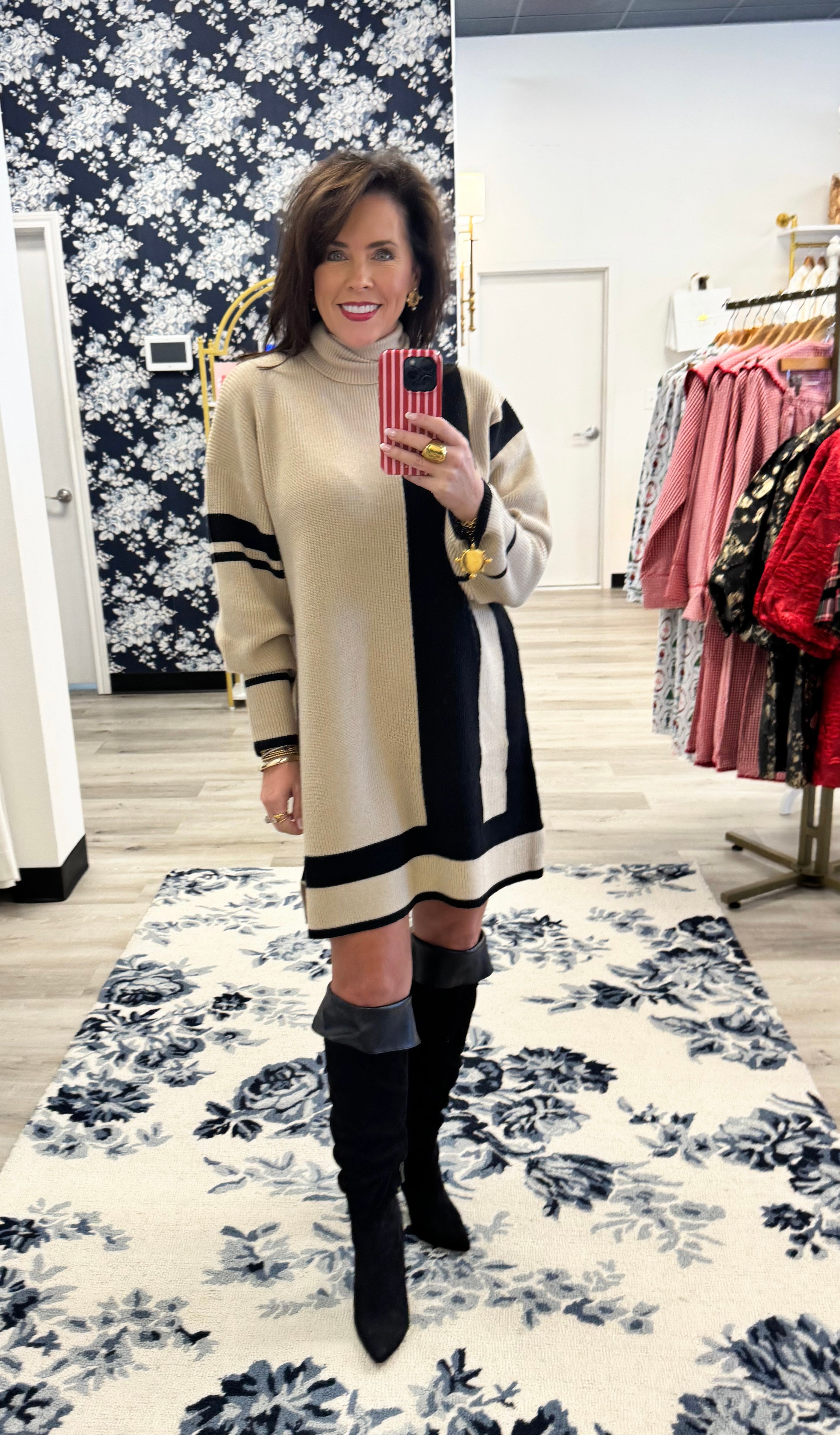 Elevate your wardrobe with this refined turtleneck sweater dress, a versatile piece that transitions seamlessly from day to evening. Crafted in a luxurious blend, it features a classic mock neck and a flattering mini silhouette that skims the body gracefully. The structured knit construction ensures durability while maintaining an elegant drape. Perfect for layering with boots , this dress embodies understated luxury and modern sophistication.