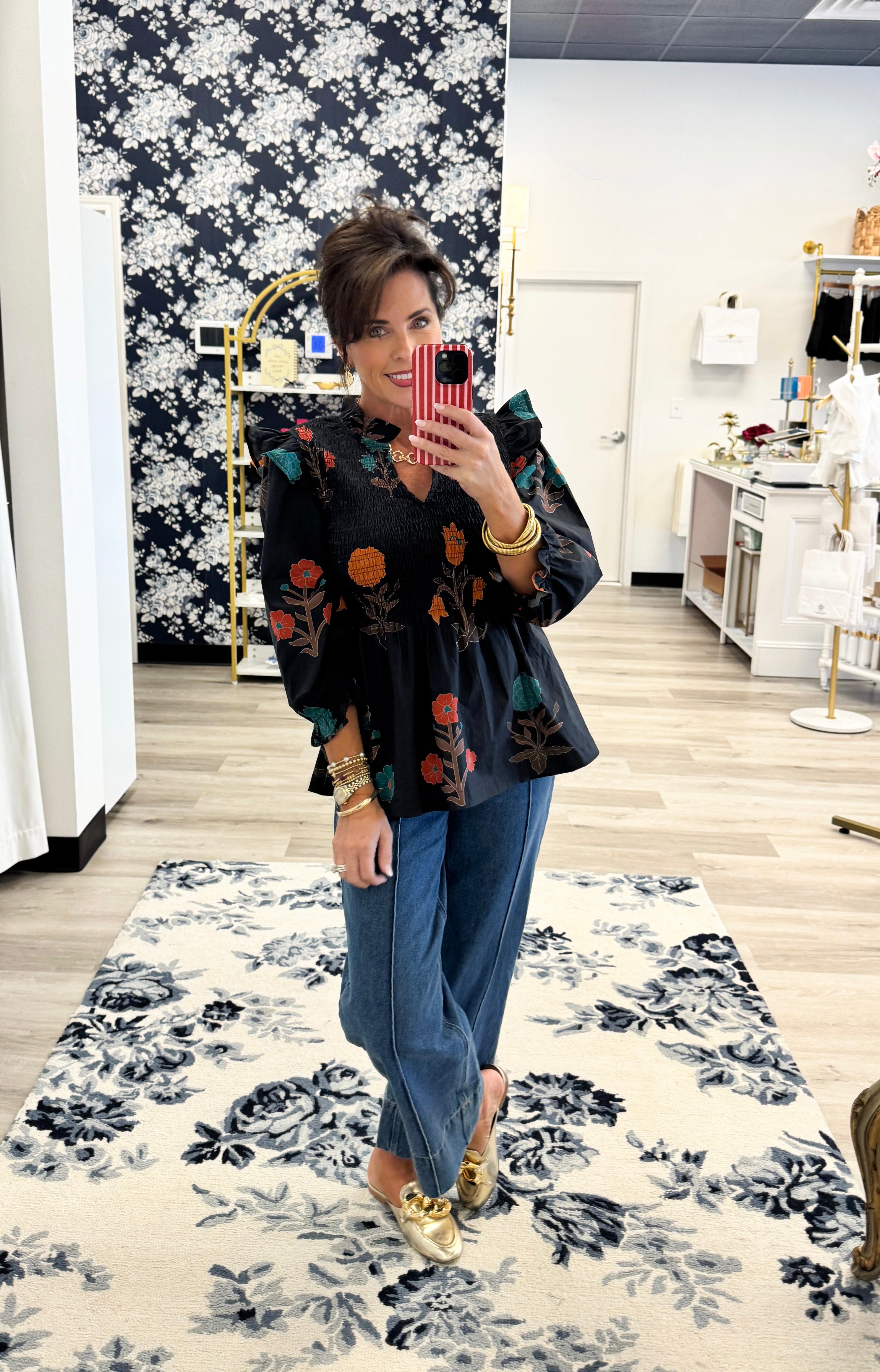 The Camille Fleur Top is a romantic fusion of structure and softness. Crafted in a delicate botanical print, it features a smocked bodice that contours the silhouette while ruffled shoulders add a touch of refined drama. 3/4 sleeves with elastic cuffs create graceful volume, balancing ease and elegance. Lightweight and woven for breathable comfort, this piece transitions effortlessly from casual denim pairings to evening sophistication. A timeless expression of feminine chic.