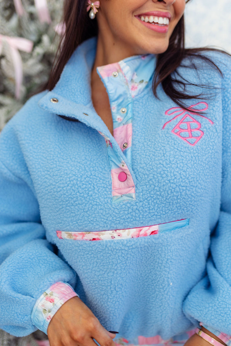 Cozy ice blue fleece jacket with embroidered floral detailing. Perfect winter layering piece with comfortable fit.