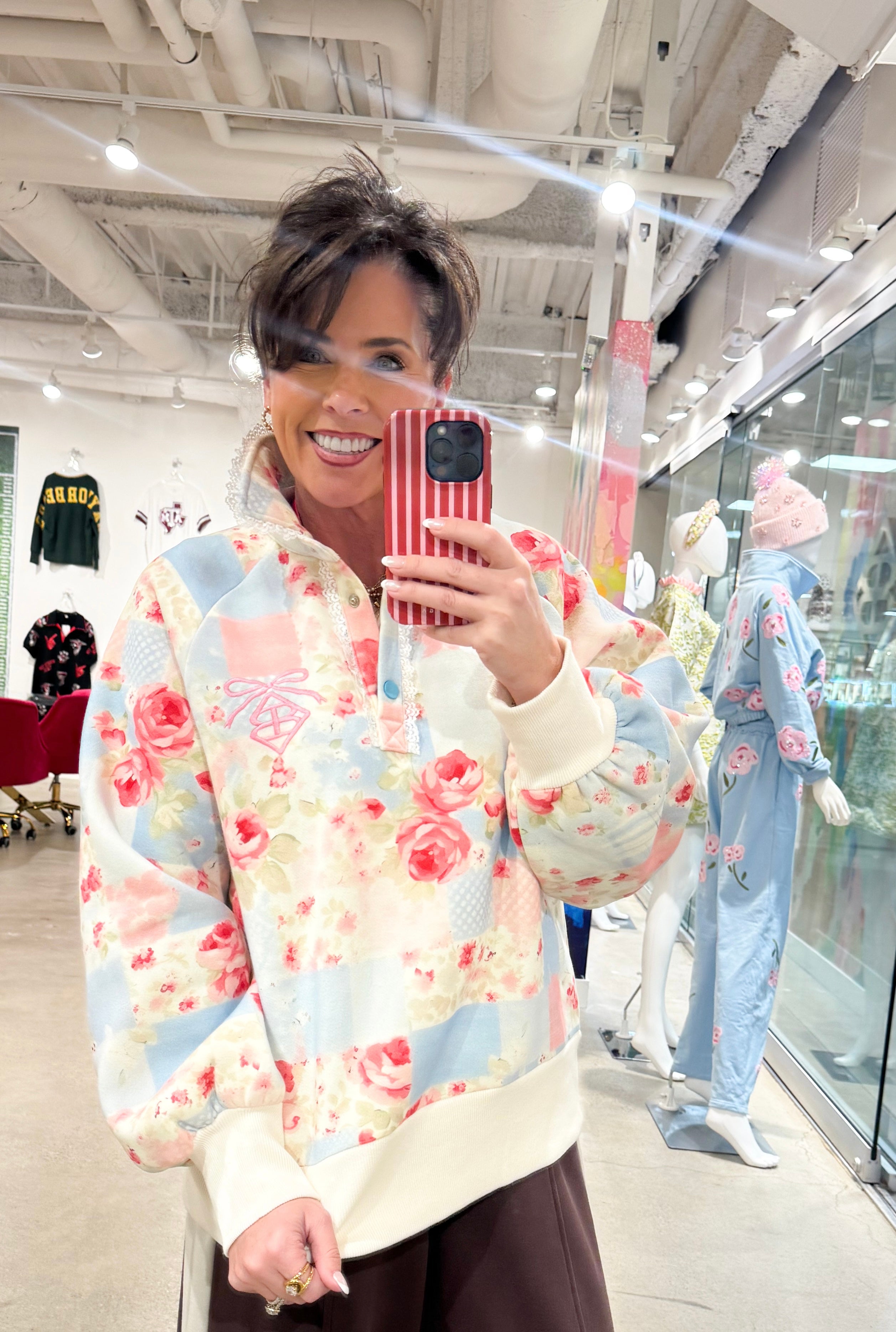 Wrap yourself in effortless elegance with this Brianna Cannon patchwork floral sweatshirt. Crafted from a soft cotton-polyester blend with cozy fleece lining, it features a distinctive lace-trimmed collar and convenient snap closure for easy layering. The feminine patchwork design and embroidered signature bow logo deliver refined style, while the relaxed fit ensures comfort through cold-weather months. Perfect for transitional dressing that balances sophistication with casual ease.