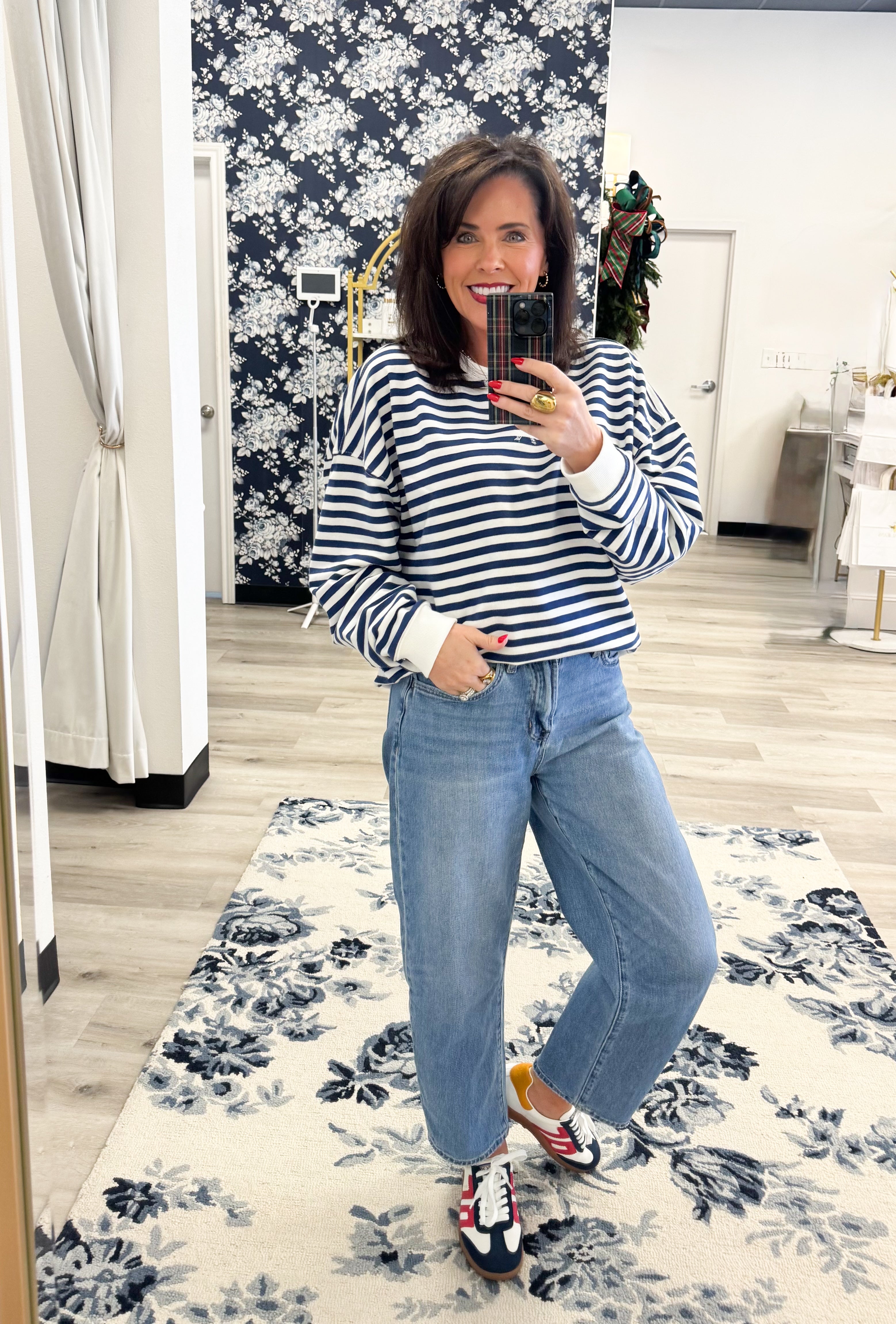 The Maxwell Top combines timeless elegance with modern versatility. This stripped knitted pullover features a refined blue and white pattern that effortlessly transitions from casual weekends to polished weekday styling. The long sleeves and pullover design offer comfortable coverage, while the quality knit construction ensures durability and a flattering fit. A sophisticated staple that pairs beautifully with everything from tailored trousers to your favorite denim.