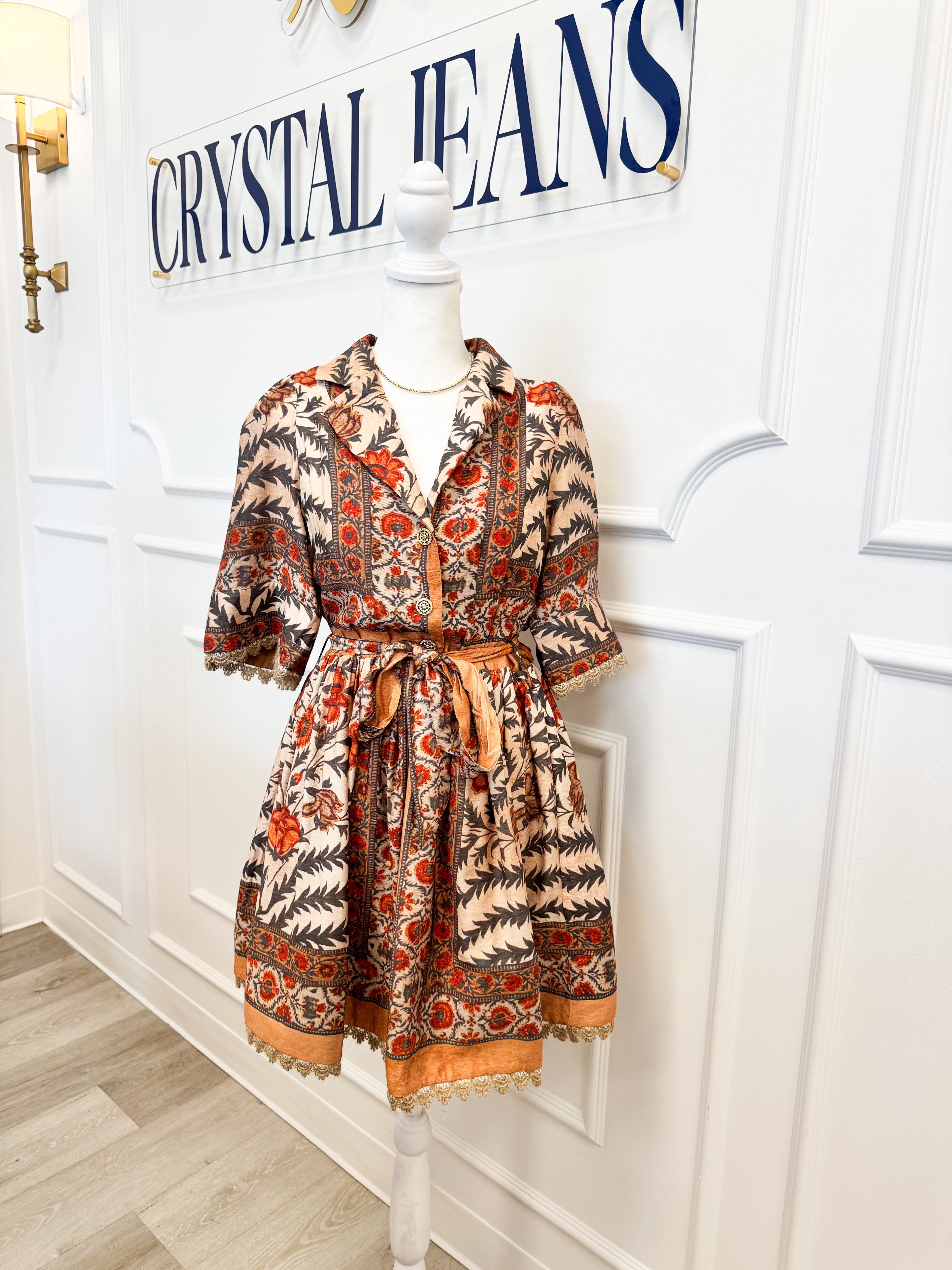 The Rosewood Charm Dress embodies effortless romance with a touch of vintage elegance. Designed in a botanical print with warm rosewood tones, this puff sleeve dress features delicate lace trim at the sleeves and hem for a feminine finish. A button-front closure and elasticated back waist create a flattering fit, while the removable self-belt allows versatile styling. Thoughtful details like side pockets and a lightweight lined construction ensure comfort without compromising sophistication. A graceful piece that transitions seamlessly from daytime gatherings to evening occasions.