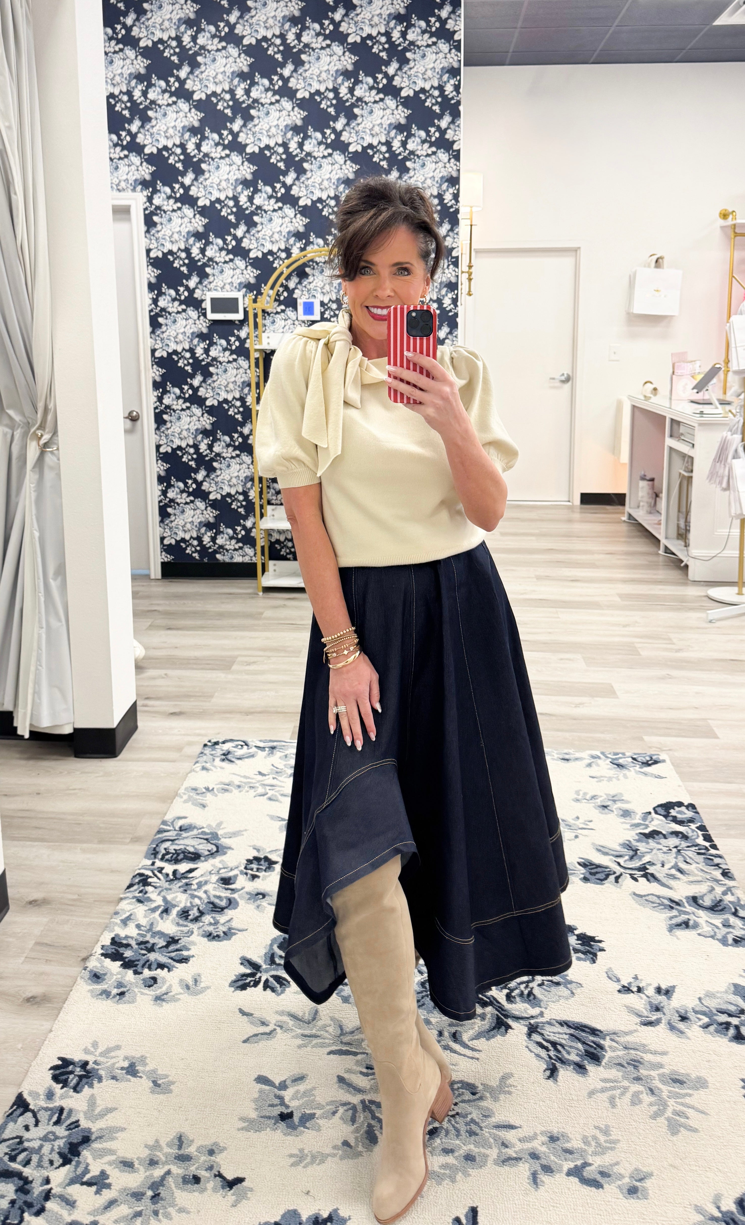 Designed with intention and structure, the Sculpted Denim Midi Skirt is crafted from a firmer denim that naturally holds its shape and creates a beautiful wave as you move. The architectural cut and paneled design give this skirt its signature sculpted silhouette, while the structured fabric ensures a polished, elevated look every time.