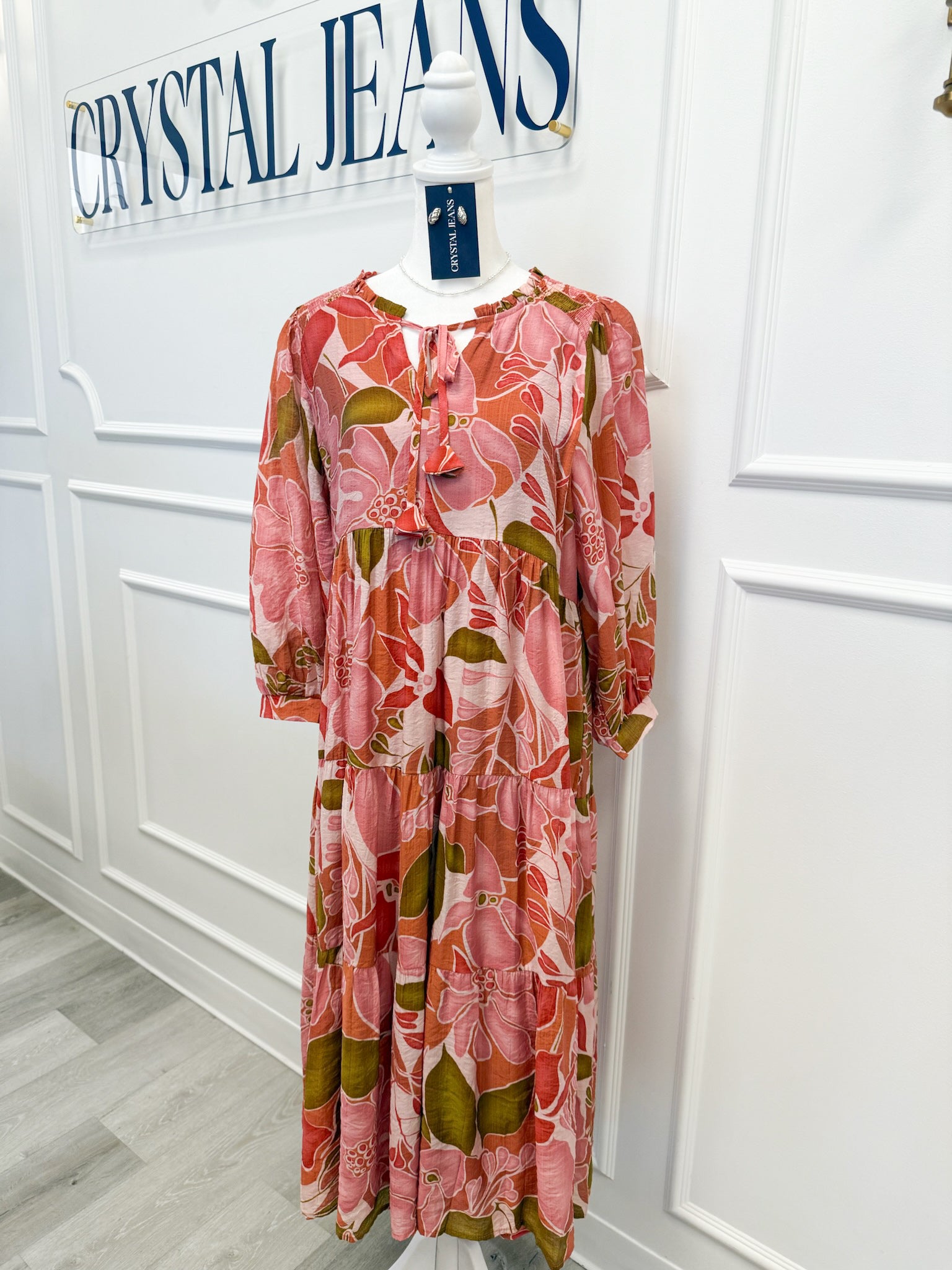 Bring a touch of wanderlust romance to your wardrobe with the Solana Bloom Dress. Awash in vibrant pink and coral tones with earthy green accents, this floral print midi feels equal parts retro and modern. The neckline features tassel ties for a playful finish, while ¾ puff sleeves with elastic cuffs add an airy, effortless silhouette. A tiered skirt flows with ease, making this the perfect dress for weekend getaways, garden parties, or simply savoring sunny afternoons. Lightweight and unlined, it layers gracefully and drapes with fluid movement.