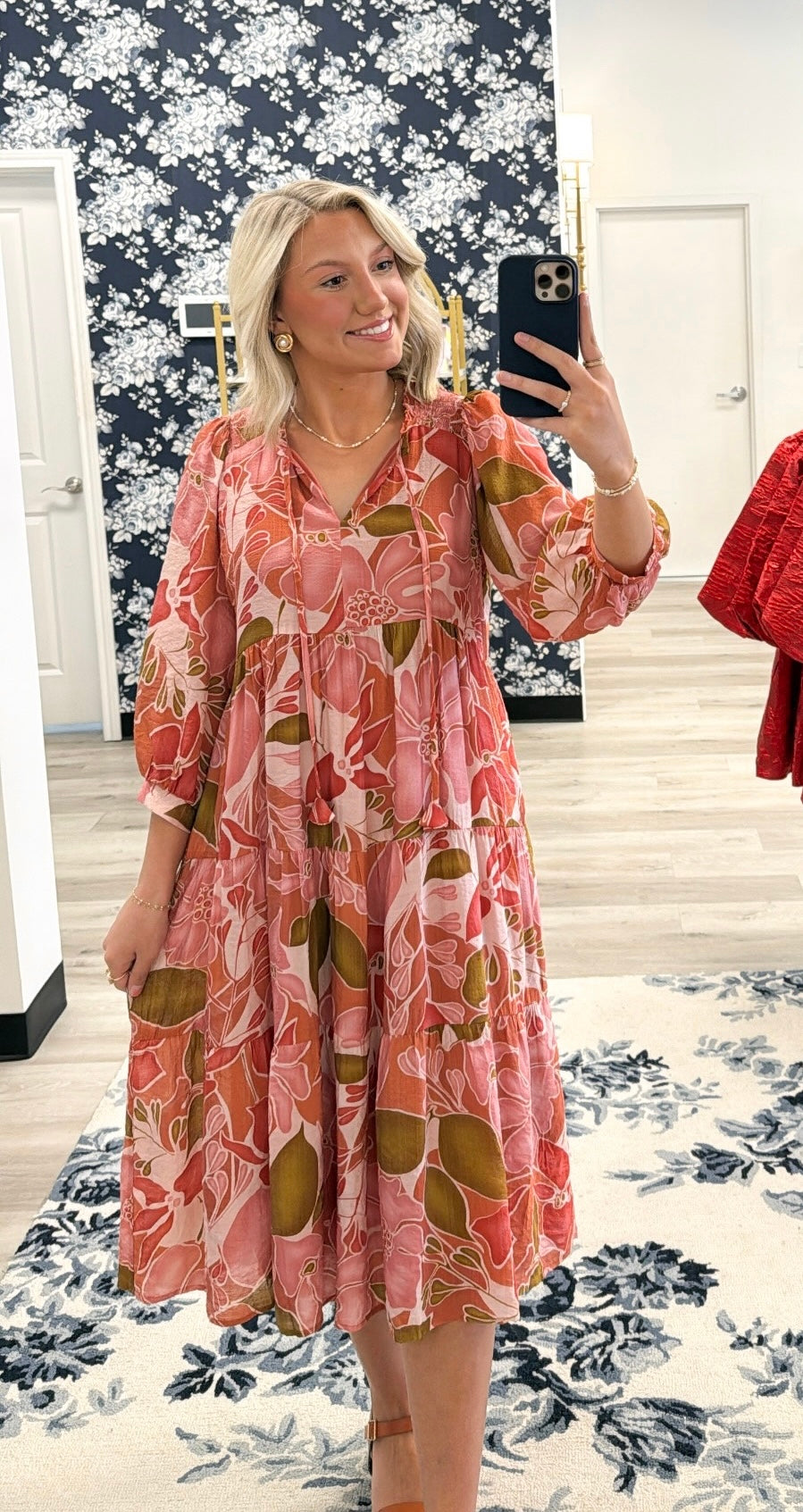 Bring a touch of wanderlust romance to your wardrobe with the Solana Bloom Dress. Awash in vibrant pink and coral tones with earthy green accents, this floral print midi feels equal parts retro and modern. The neckline features tassel ties for a playful finish, while ¾ puff sleeves with elastic cuffs add an airy, effortless silhouette. A tiered skirt flows with ease, making this the perfect dress for weekend getaways, garden parties, or simply savoring sunny afternoons. Lightweight and unlined, it layers gracefully and drapes with fluid movement.