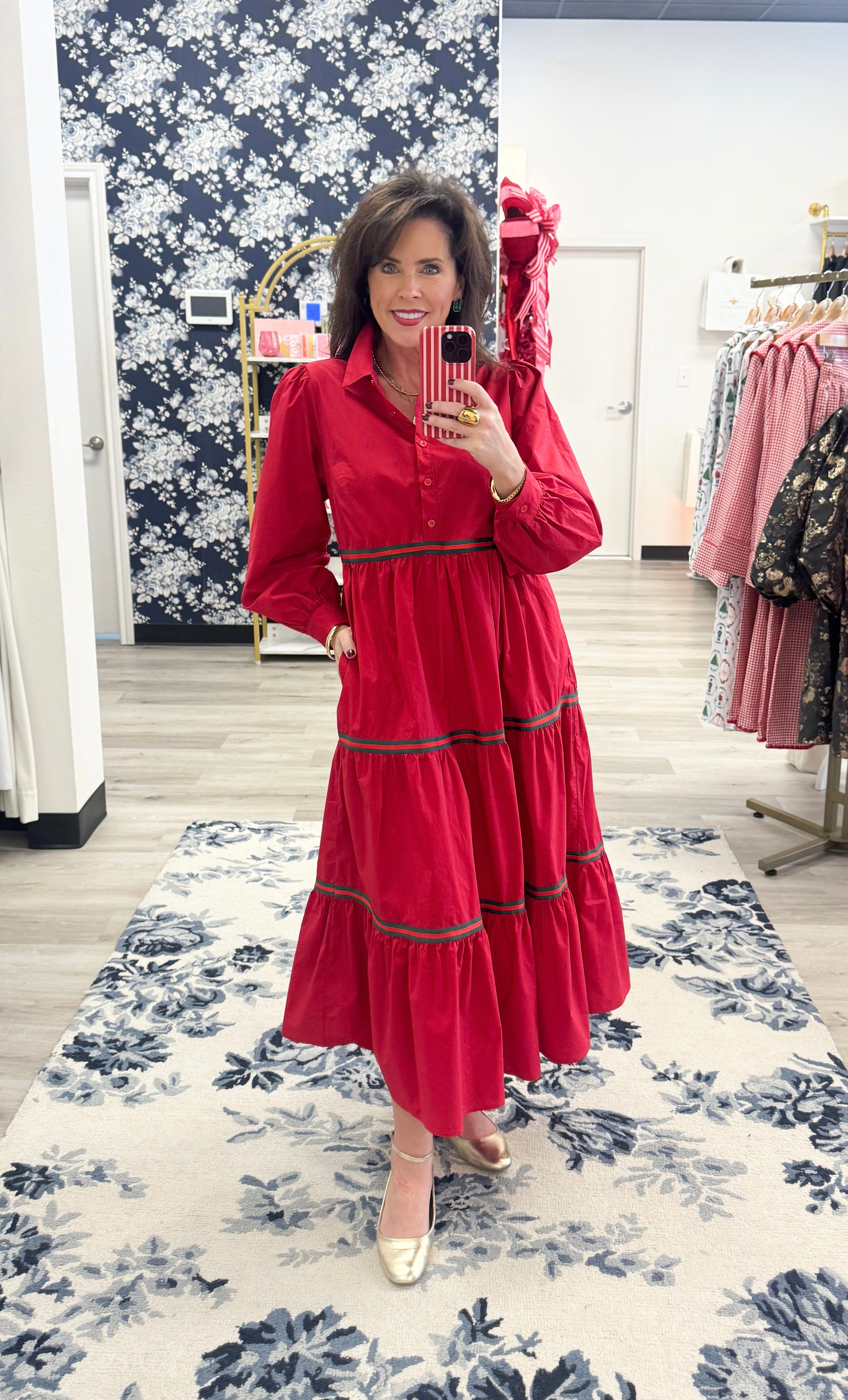 The Magdeline dress combines refined tailoring with striking details for a sophisticated look. Crafted in vibrant red, it features a button-down front, long sleeves, and a classic collar. Subtle green ribbon accents add a distinctive touch, elevating this dress into a timeless piece ideal for elegant occasions and polished everyday wear.