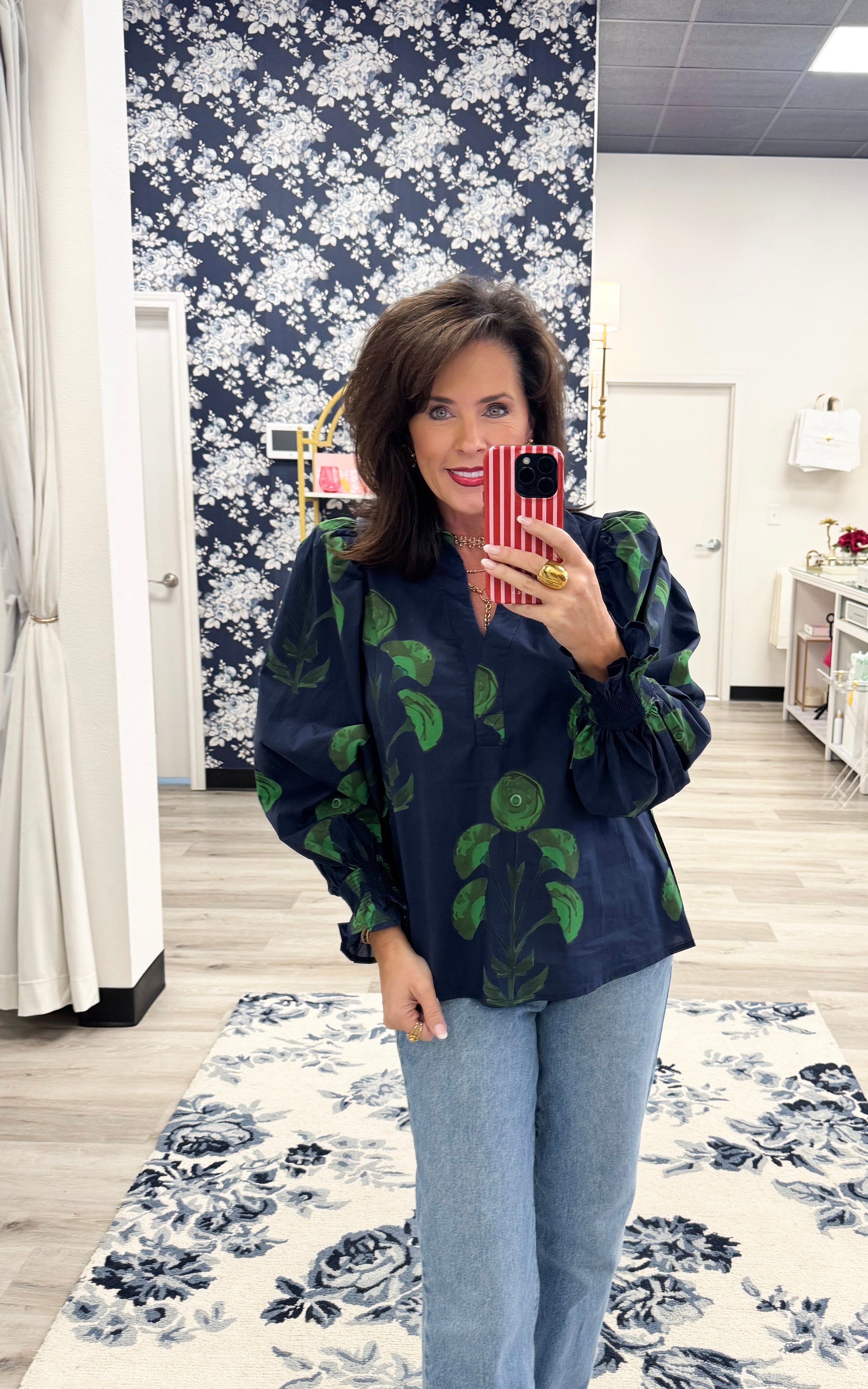 Elevate your wardrobe with the "Tiffany" floral print top, a sophisticated blend of navy and green hues. This woven, lightweight blouse features elegant long puff sleeves with smocked cuffs and a collared split neckline, balancing classic charm with modern style. Its non-sheer, unlined fabric ensures comfort and versatility, making "Evelyn" a refined choice for any occasion.