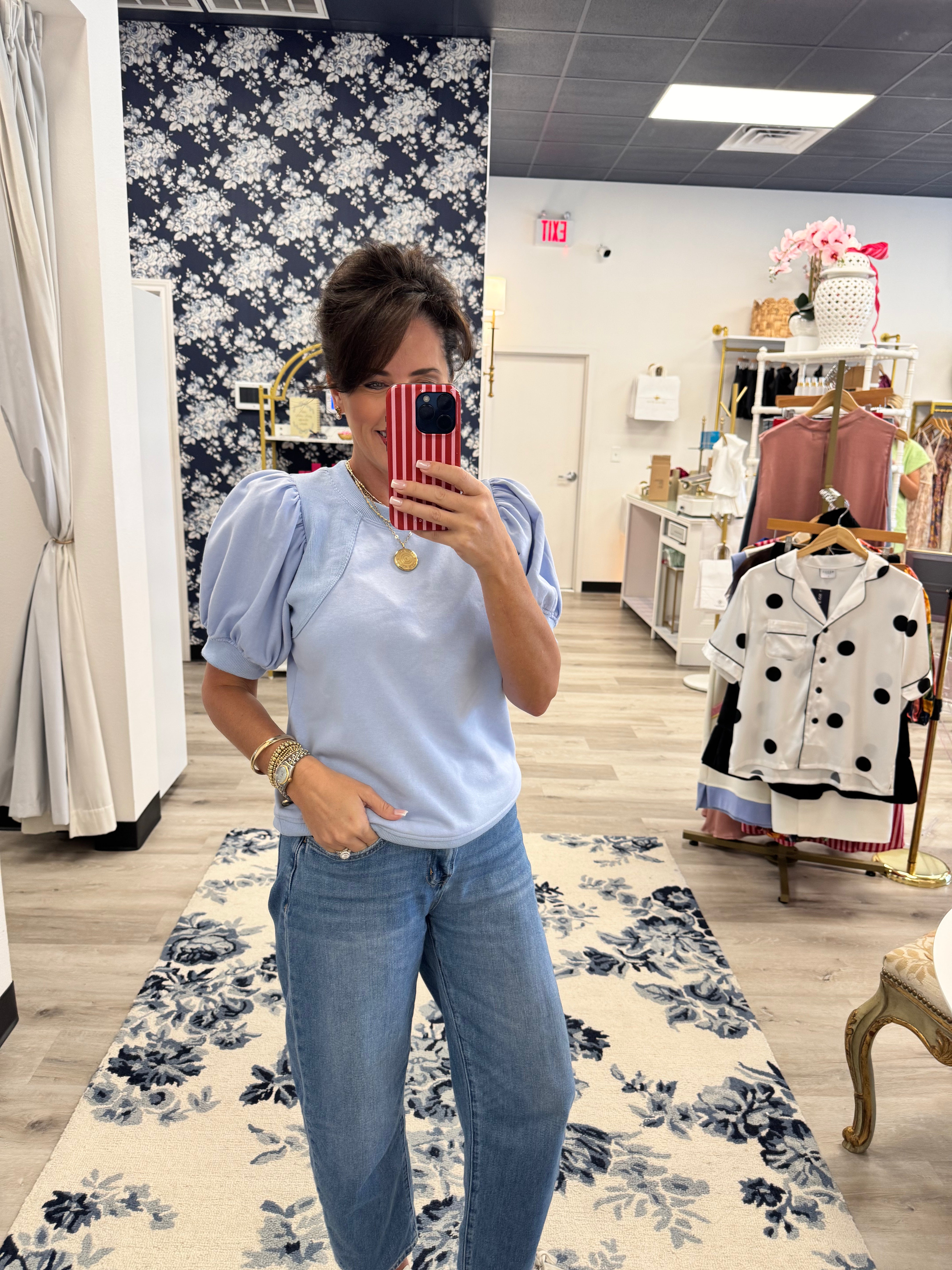 Laid-back comfort meets polished style in the Powder Blue Haven Short Sleeve Sweatshirt. Cut from a soft, mid-weight knit, this elevated basic features a relaxed crew neckline, short puff sleeves with gentle pleating, and an easy straight hem. The fresh powder-blue hue gives it a crisp, modern feel, while the sweatshirt-inspired fabric keeps it cozy without sacrificing refinement. Pair it with white denim, tailored joggers, or a sleek skirt for an effortless, put-together look.